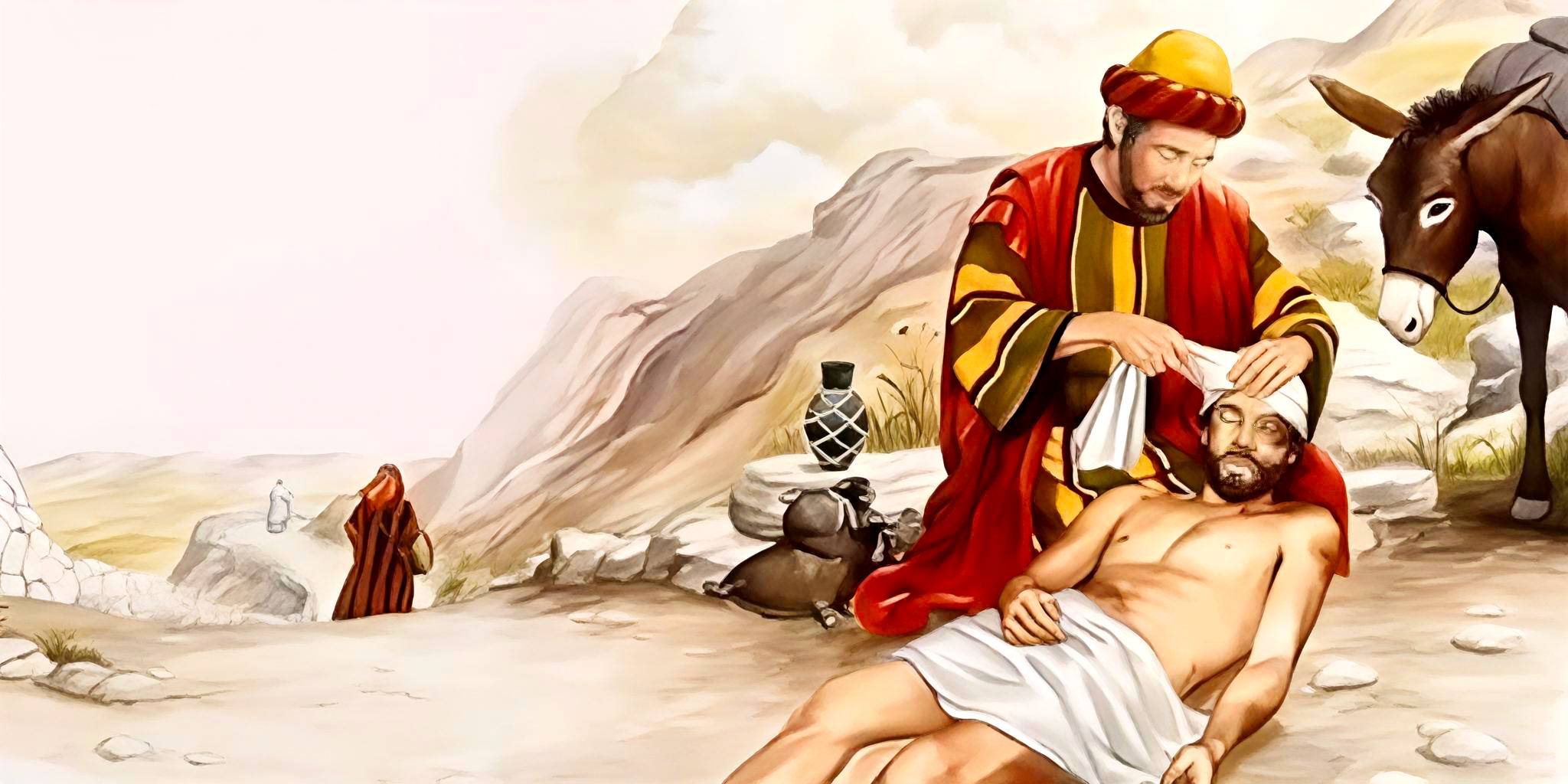 耶稣就打了一个比方:“有一个人从耶路撒冷去耶利哥,落在强盗手中被剥去衣裳打得半死丢在路边。有两个同样精通宗教的神职人员先后路过,对此却视而不见。